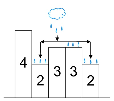 如上图所示,每个位置都有一个建筑,每个位置占据的宽度都是一样,可能有不同的高度,现在需要挑选一个位置的上方开始人工降雨,问你最多能淋到雨的位置有几个。如果一个位置能被雨淋到,而且紧挨着的旁边的建筑不高于他,那么旁边的建筑也能被雨淋到,上图中在中间的地方降雨总共有4个位置会被淋到。