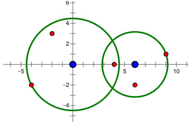 样例中的导弹拦截系统和导弹所在的位置如下图所示。要拦截所有导弹,在满足最小使用代价的前提下,