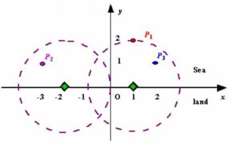假设海岸是一条无限长的直线,陆地位于海岸的一侧,海洋位于另外一侧。
