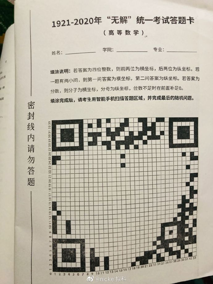 新浪微博上有网友发文称:“朋友买了本玻尔X海森堡的物理大佬同人本,送了300道高数题。更绝的是,要做完题目按照答案涂答题卡,涂出一个二维码,扫描二维码才能看到特典,做错了就看不到了……”那张传说中的答题卡如下图所示: