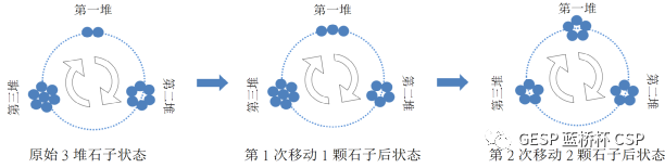 第2次从第三堆石子中拿2颗移动到第一堆的石子中,此时3堆石子的数量依次为5、5、5。